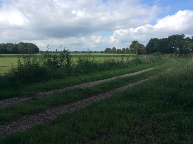 Wel een rupsje op mijn been, zie ik. Een half uur maak ik nu zelfgekozen deel uit van dit idyllische plekje en dat wordt door sommige ‘autochtonen’ blijkbaar als opvallend en onderzoekswaardig ervaren. Een wesp komt even een kijkje nemen. De wind waait door de struiken achter me en laag over het weilandgras voor me scheren zwaluwen kris kras voorbij. Heen en weer, steeds opnieuw. Rechts van me hoor ik ganzen snateren. Van die kant ook spelende kindergeluiden. Waarschijnlijk gasten van camping Landgoed de Gortmeule.
