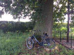 De omvang van de boom wordt pas echt duidelijk wanneer je die in verhouding ziet met een alledaags gebruiksvoorwerp: een fiets. Vier van die fietsen zou je tegen die boom aan kunnen zetten en dan zouden ze elkaar volgens mij niet raken. Ik heb maar één fiets bij me, dus ik kan dat niet proefondervinderlijk onderbouwen. Maar evengoed..