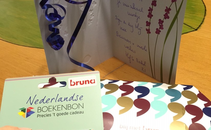 Van het vanmiddag tot mij ‘veroordeelde’ luisterpubliek ontving ik na afloop een bedankcadeautje. Zojuist -het is nu bijna middernacht- heb ik dat presentje geopend. ‘Lieve Geert’, zo opent de kaart, die vastzit aan een mooi verpakte boekenbon van de Bruna. Ik wordt er een beetje verlegen van. ‘Lief’, denk ik meteen. ‘Had niet gehoeven’ is een tweede gedachte. ‘Maar je vindt het wél leuk’, galmt een ander stemmetje heel eerlijk door mijn hoofd. En dat is zo.