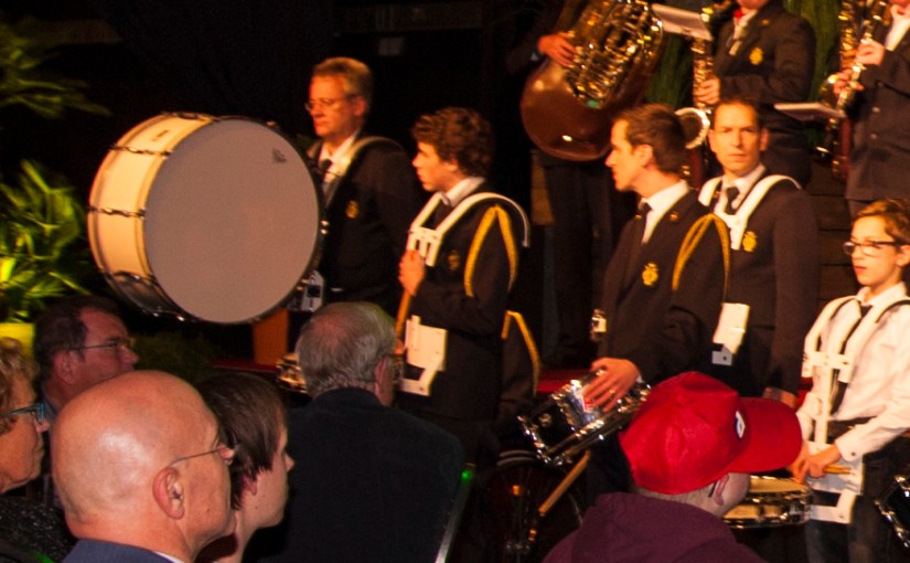 ’n Moment tijdens de afscheidsreceptie van burgemeester Kees van Rooij, gisteravond in de Merthal. De koninklijke harmonie van Horst had zich opgesteld op de bühne. De drumband stond er voor. Tijdens mijn aankondiging zag ik de burgemeester al naar voren komen. Prima, want anders had ik hem sowieso naar voren gevraagd om de serenade in ontvangst te nemen. Daar waar hij plaats wilde nemen, liep ook Pieter enthousiast kleine rondjes.