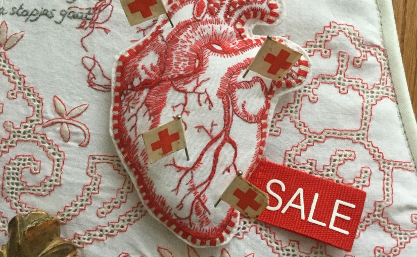 Wat me in haar werk zo aansprak, waren de verweven herinneringen die ze zeer gedetailleerd bij, in, met en door elkaar had verwerkt. Foto’s van vroeger, kleine attributen, dagelijkse dingen, stof en draad. Garen heet dat geloof ik, in borduurtermen. Want de borduurtechniek was, voorzover ik daar verstand van heb, tot in de perfectie doorgevoerd en dienstbaar aan de boodschap die eenieder in haar werkstukken mocht lezen en zien. Háár boodschap, maar door eigen interpretatie ook de onuitgesproken boodschap en de herinnering van iedereen die het werk bewonderde.