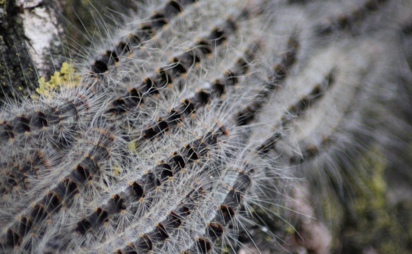 Recht boven de houten bank, onder aan een stevige tak van de 200-jarige eik, zie ik ze zitten. Een nest eikenprocessierupsen. Ik had al zo’n vermoeden dat ze er zouden zitten, omdat ik van een vorige schrijfsessie onder de eik, nietsvermoedend een jong eikenprocessierupsje mee naar huis had genomen.