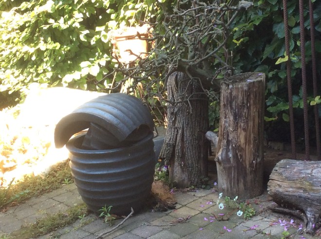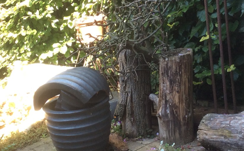 Vlakbij me een pot waarvan de inhoud de scherven zouden kunnen zijn van zichzelf. Ze waren met z’n tweeen. Sinds er een kapot viel, ‘vult’ die de ander. Ze staan voor twee afgezaagde boomstammetjes, waarvan de één zijn schors al verloren heeft, terwijl de ander daarmee bezig is.