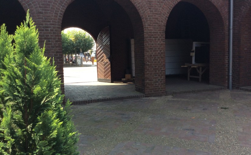 De poorten staan aan twee kanten open. Er staan houten tuinbanken in de schaduw. Op mijn tocht naar een van mijn ‘vaste’ schrijfplekken, fiets ik door het centrum van Horst. Ik passeer de Lambertuskerk aan de zuidkant en zie dat de poort naar het Atrium open staat. In een flits zie ik er de tuinbanken staan. In de secondes die het duurt voordat ik de poort aan de noordzijde passeer, ontstaat het plan.