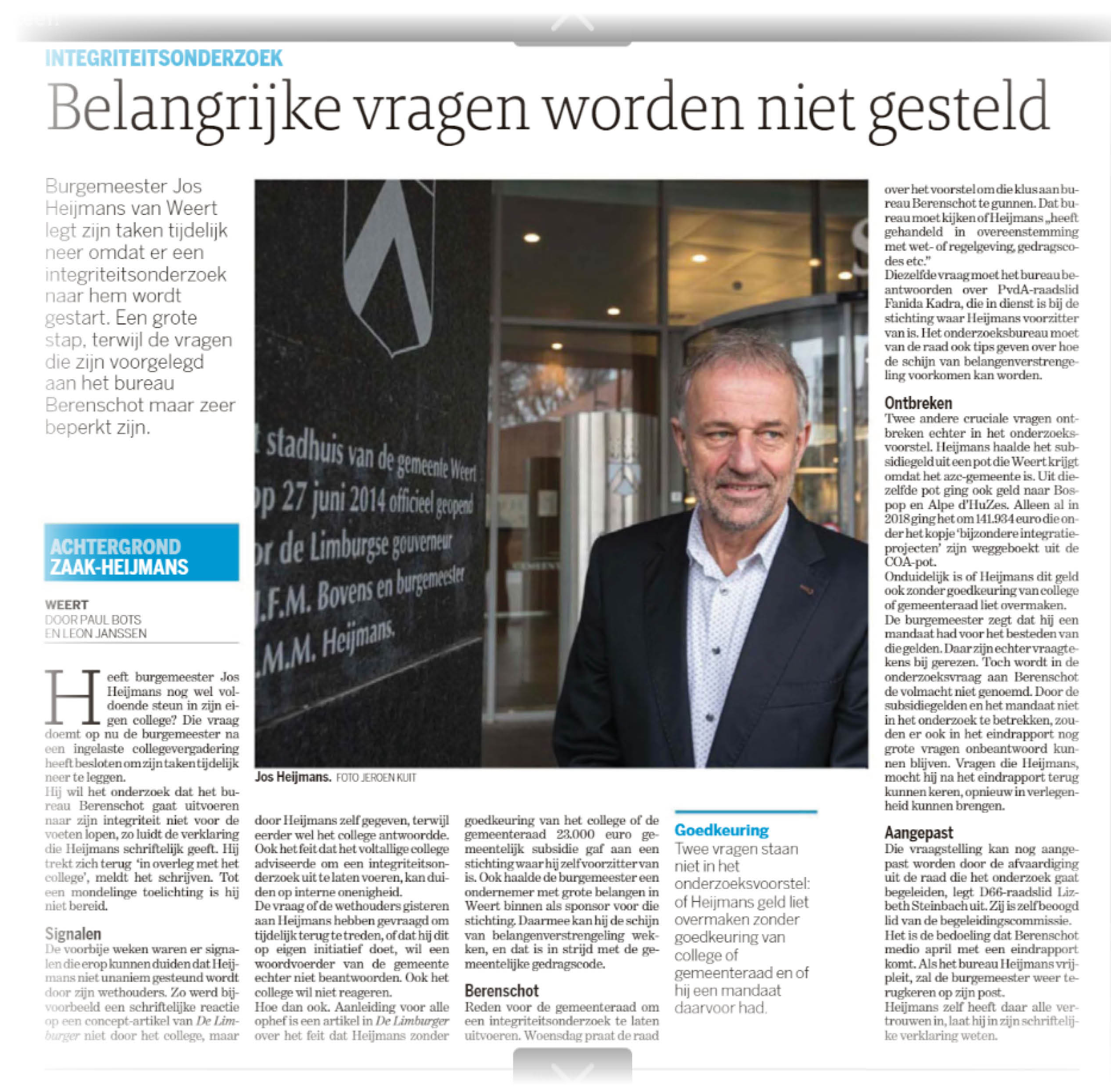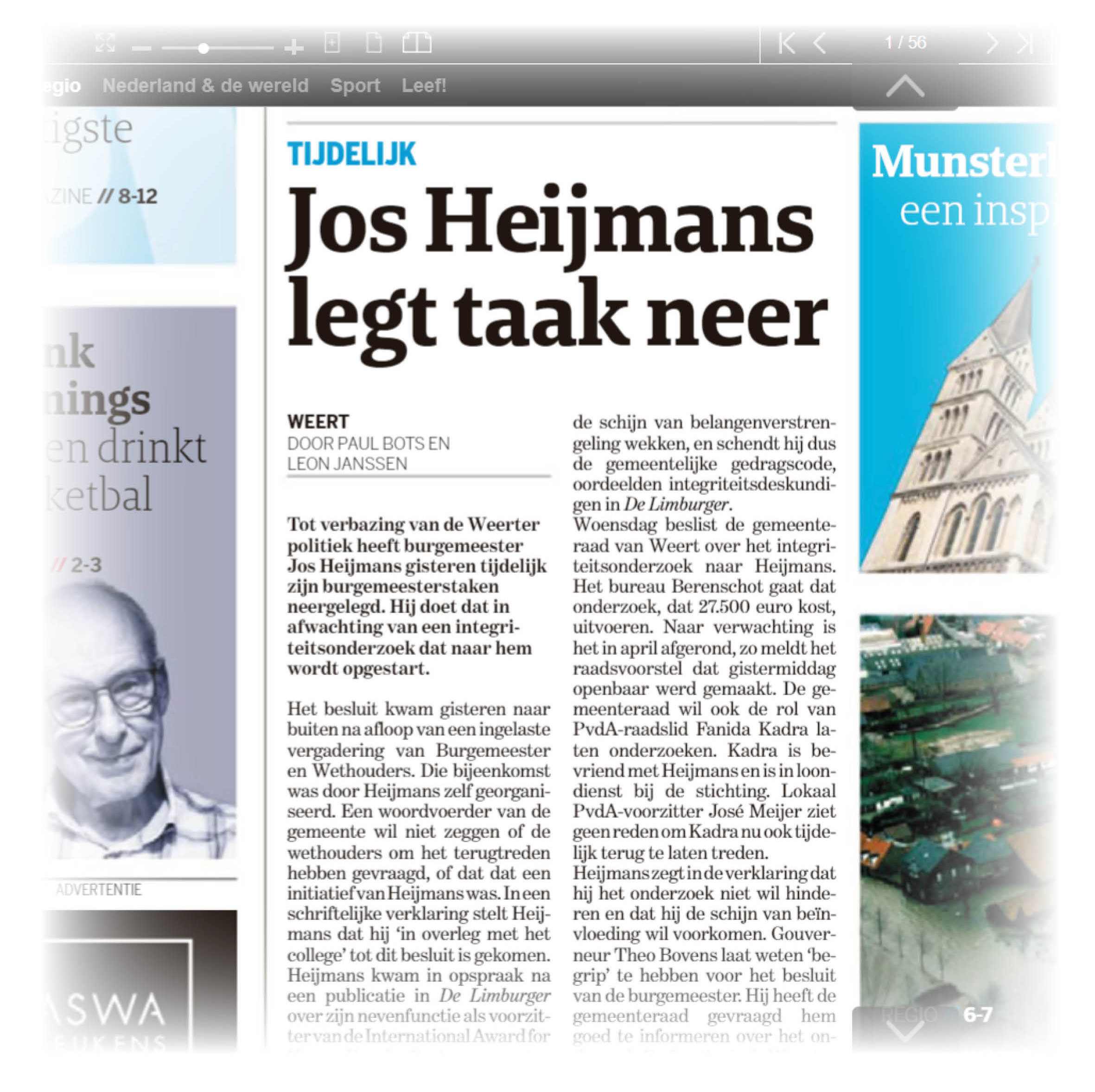 ‘Jos Heijmans legt taak neer’. ‘De Limburger’ heeft het zaterdagochtend met chocoladeletters op de voorpagina van de krant gezet. ‘Tijdelijk’ staat er met iets kleinere blauwe letters boven de kop. Wat is er aan de hand? Burgemeester Jos Heijmans van Weert heeft zichzelf tijdelijk op non-actief gezet. Hij wil het onderzoek dat zijn gemeenteraad naar hem wil instellen, niet hinderen of de schijn wekken dat hij het onderzoek zou beïnvloeden. Ik kan me daar wel iets bij voorstellen.