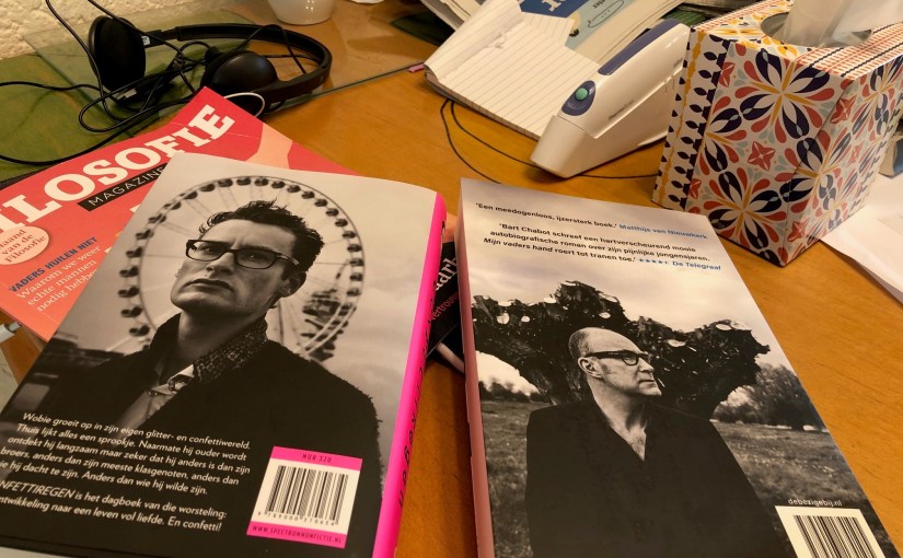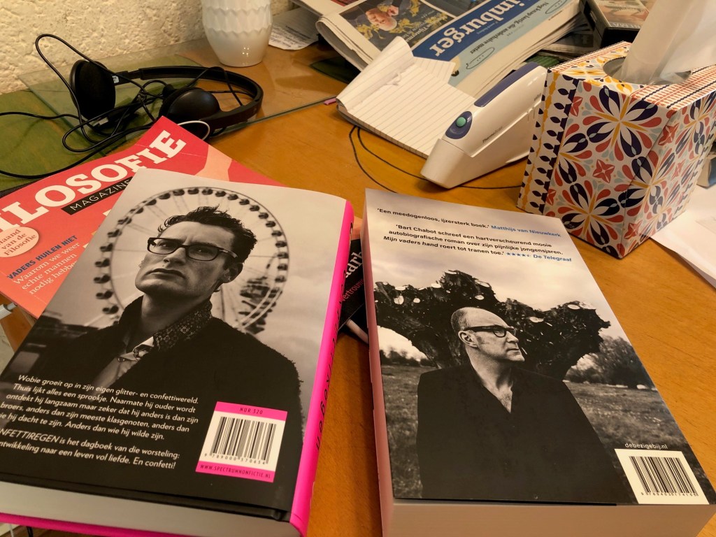 Ik sta bij de Bruna en zie beide boeken in de top 10-kast staan. Hoe zou het zijn, vraag ik me af, om tegelijk met de gedachten van een vader én zijn zoon geconfronteerd te worden. Gedachten die ze nagenoeg gelijktijdig op papier hebben gezet. Want ik zie dat ‘Confettiregen’ van Splinter Chabot op 3 maart is uitgebracht terwijl het boek ‘Mijn vaders hand’ van zijn vader, Bart Chabot, in januari uitgekomen is. Scheelt bijna niks.