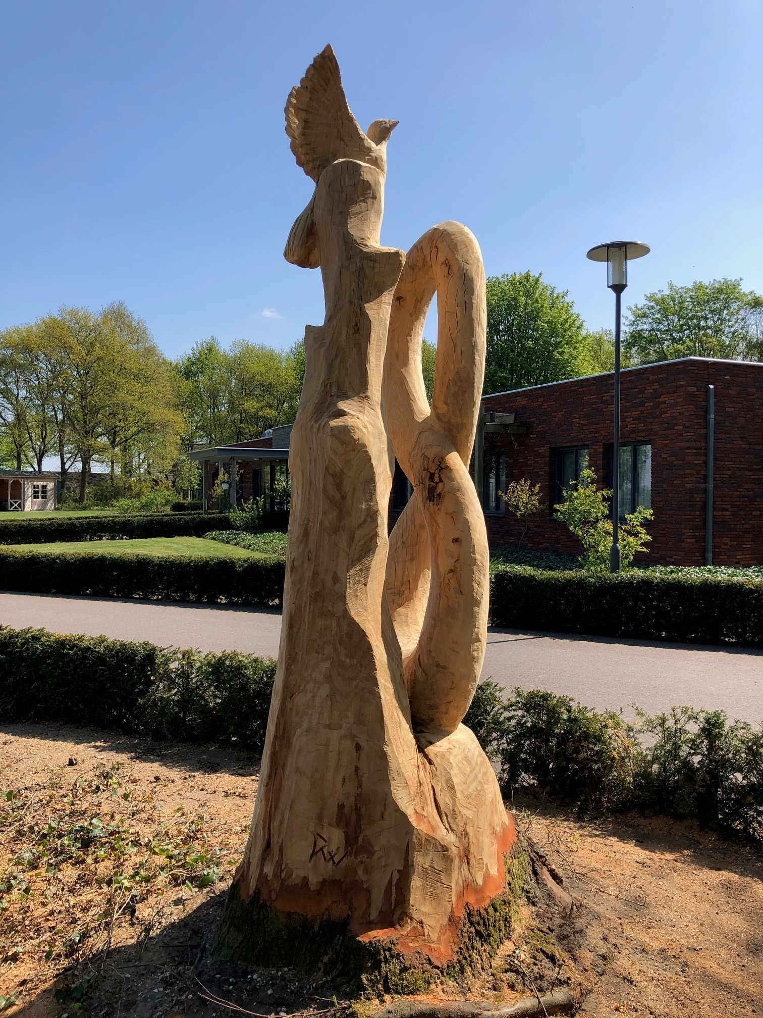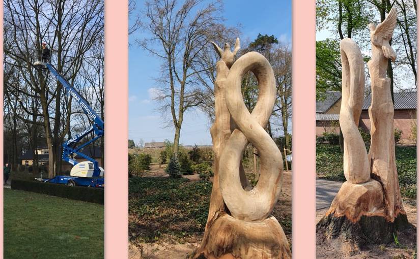 Soms komen dingen samen en dan moet het zo zijn. Twee weken geleden zag ik een bericht op de facebookpagina van Hospice Buurtzorghuis Doevenbos. Er bleek ter plekke een oude, zieke eik geveld. Maar niet zomaar. Wortels en een deel van de stam bleven staan, zodat boomkunstenaar Roel van Wijlick daar een prachtig kunstobject van kon maken. Het facebookbericht heb ik meteen gedeeld op de facebookpagina van de Vrienden van Hospice Doevenbos. Dat was op zaterdag 11 april.