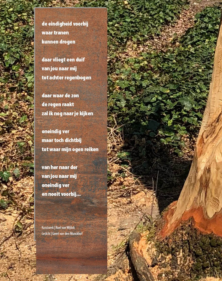 Een week geleden kreeg ik een appje van Sylvia, een van de verpleegkundigen van Hospice Doevenbos. Het kunstwerk kwam opnieuw ter sprake. Ze vroeg me of ik er een gedicht bij wilde maken. En in een tweede berichtje dat er vrij snel achteraan kwam (Sylvia is ook best praktisch), of ik dan ook voor het bordje kon zorgen dat bij het kunstwerk moest komen te staan.