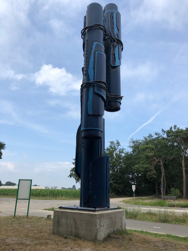 Een waardeloos richtingsgevoel. Maar wat maakt het uit. Nu zittend op de plek waar de Broekhuizerdijk overgaat in de Horsterweg. Vlak voor me staat een gigantisch blauw buizenkunstwerk, waar me nu pas van opvalt, dat elke buis voorzien is van een plaatsnaam: Broekhuizen, Broekhuizenvorst en Horst.