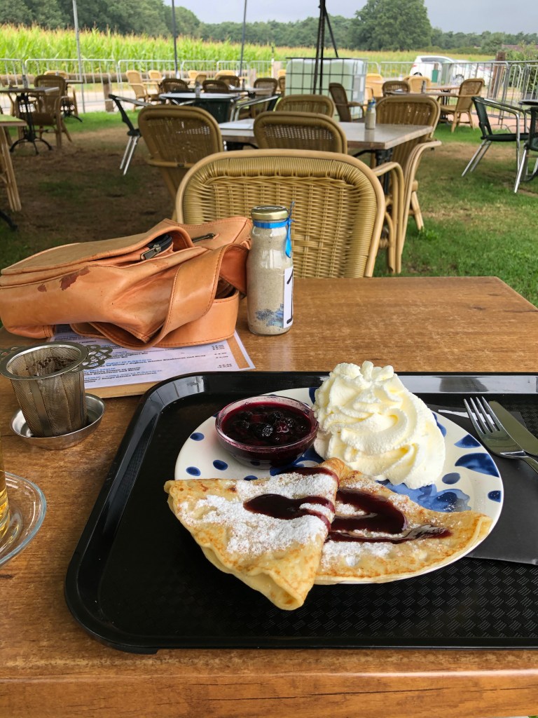 Hm. Zoals gezegd, waardeloos richtingsgevoel. Maar soit. Route bijgesteld en bij Hayberries op het terras een thee en een pannenkoek met bosbessenconfiture, slagroom en verse bessen besteld. Het was tenslotte bijna middag. Niet al te veel woorden aan vuil maken. De prijs-kwaliteitverhouding viel in de categorie ‘eigen schuld’. Zag er mooi uit, maar dat mag ook wel, voor dat geld…
