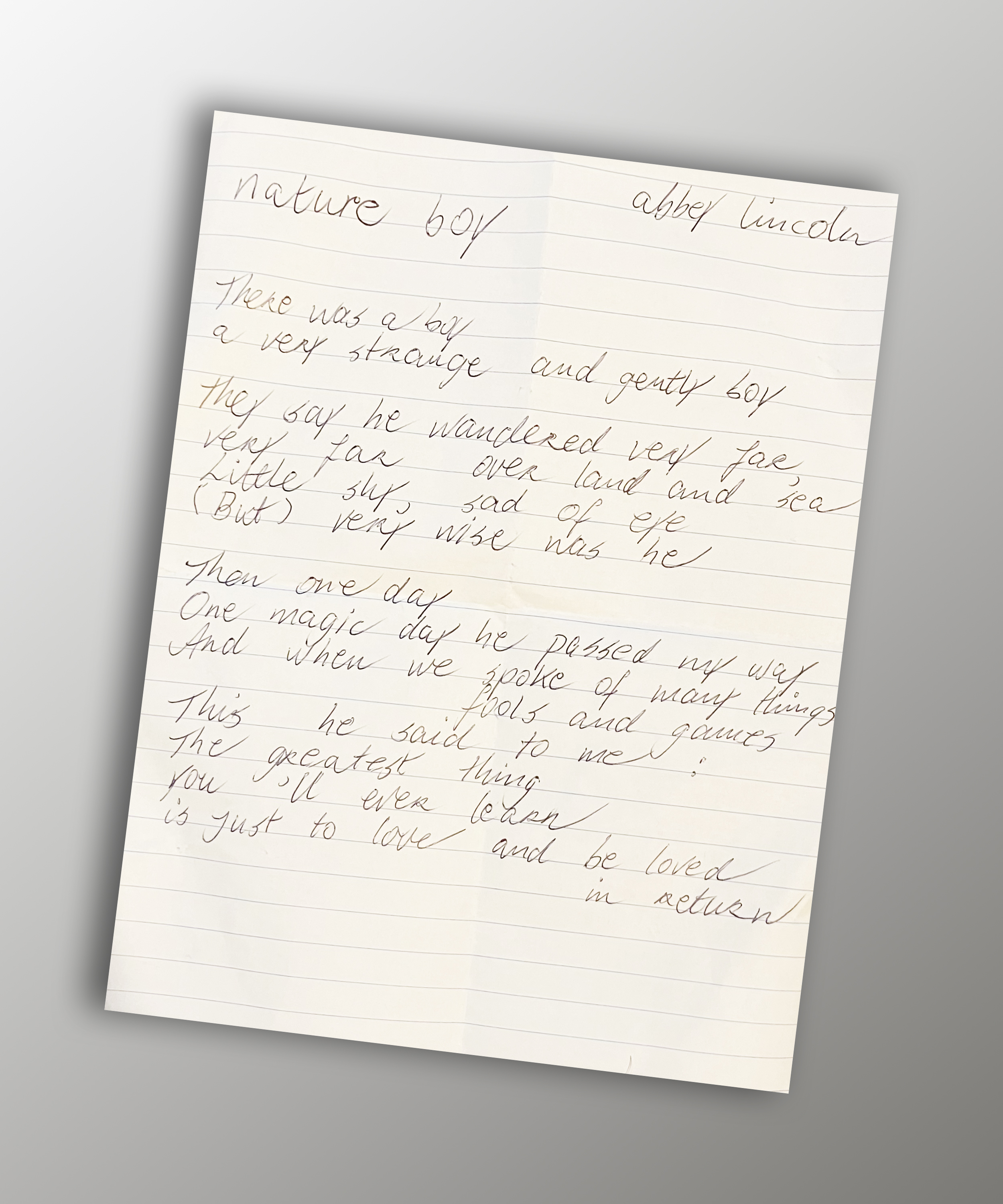 Wandelend door Horst met kleinzoon Tos in de kinderwagen kwam ik een tijd geleden Marian tegen. We praatten even en toen zei ze dat ze iets voor me had. Iets dat ze me al een hele tijd wilde geven. Ze pakte haar notitieboekje en haalde er een gevouwen velletje papier uit. Er stond een met de hand geschreven tekst op. ‘Het is de tekst van een liedje’ zei ze. ‘Nature boy’. Ken je het?’ Ik kende het niet, maar het enthousiasme waarmee ze erover vertelde, werkte aanstekelijk. ‘Jij maakt toch muziek? Misschien kun je er iets mee?’
