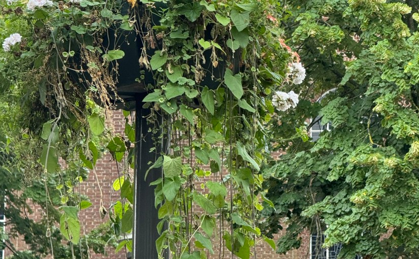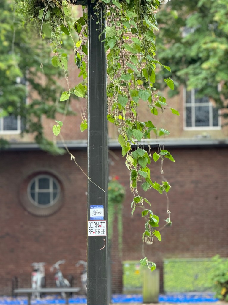 Er zitten kauwen op de kerk. Ik zie ze omdat ik ze hoor. Om de een of andere reden krasten ze ineens in gezamenlijkheid. Ik maak een foto van de kauwen en zie op de foto dan een opvallend rood plekje. Omdat ik omhoog keek, zie ik nu ook de bloembak die op zo’n drieeneenhalve meter hoogte aan een lantaarnpaal bevestigd is. Op een na, allemaal witte bloemen. Een eigenwijze bloem wilde blijkbaar rood zijn in plaats van wit. Lange slierten groen hangen uit de plantenbak. Ze waaien wat heen en weer, langs een sticker, die op ooghoogte geplakt is. ‘Born to be free’ staat er op.
