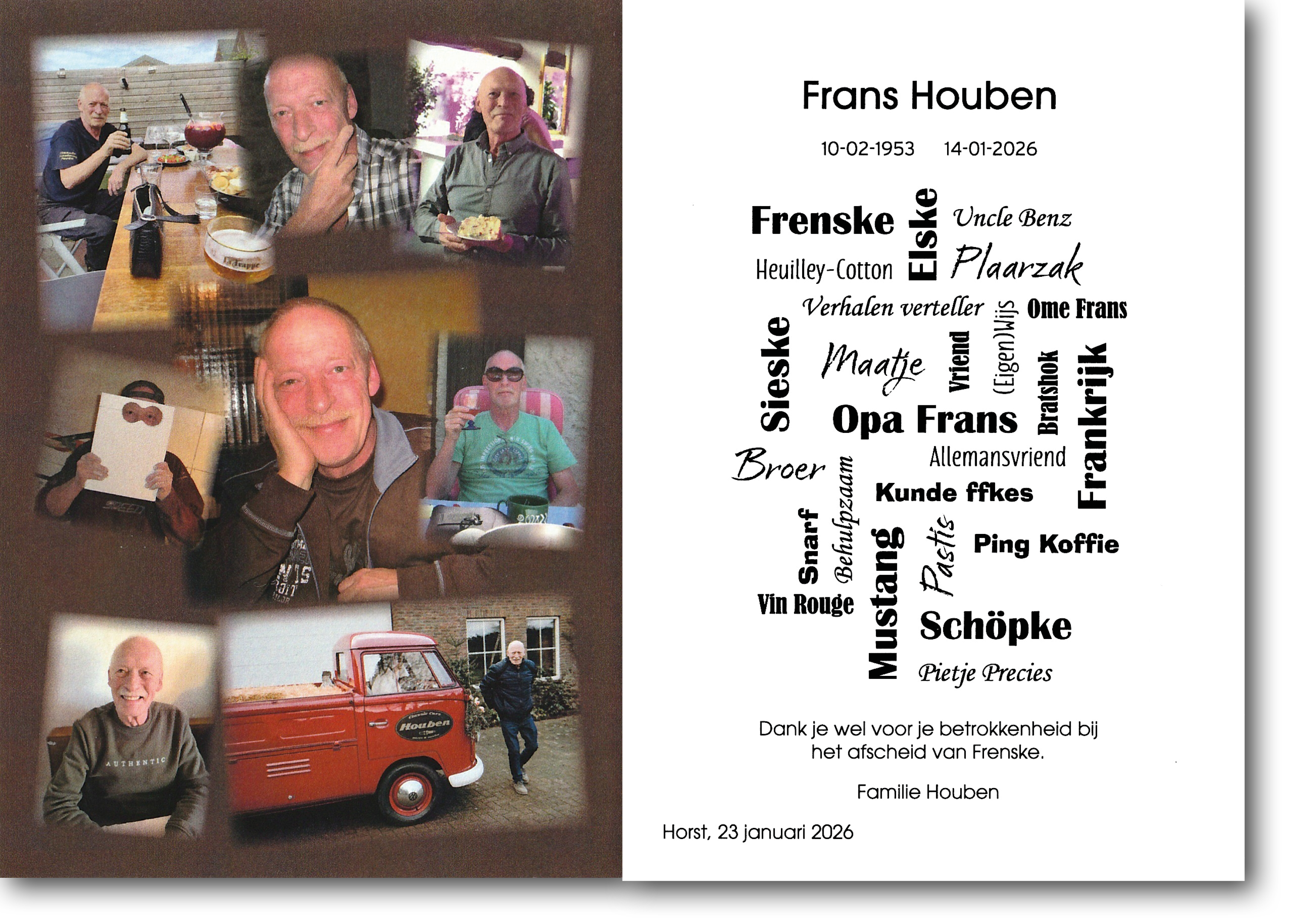 Op 14 januari was Frans in het ziekenhuis overleden. Een dag later belde Bob Noten of ik de afscheidsdienst wilde begeleiden. Van Frans Houben, las ik die avond, ongehuwd en geen kinderen. Zijn neef Guido regelde zijn afscheid en hem zou ik een dag later spreken. Hem alleen dacht ik, eventueel met zijn partner Viviënne..