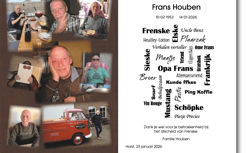 Jack Beerens kwam vanmiddag, vrijdag 23 januari, als laatste binnen in de grote zaal van ‘t Gasthoês. Hij had waarschijnlijk op Nu Horst aan de Maas de overlijdensadvertentie gelezen van Frans. Zijn vroegere klant, vriend en medewerker. Net als heel veel anderen wilde hij Frans de laatste eer komen bewijzen. Het was enorm druk.