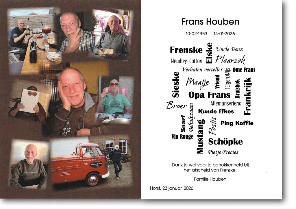 Het huilen van de Mustangmotoren overstemde even het stille verdriet van velen. Het applaus waaide Frans nog achterna. Sommigen gingen naar café de Beurs om nog meer herinneringen met elkaar te delen. Anderen gingen naar huis, waar ze misschien de gedachteniskaart nog een keer bekeken hebben, met daarop aan de ene kant foto’s van Frans en aan de andere kant steekwoorden die hem beschreven.