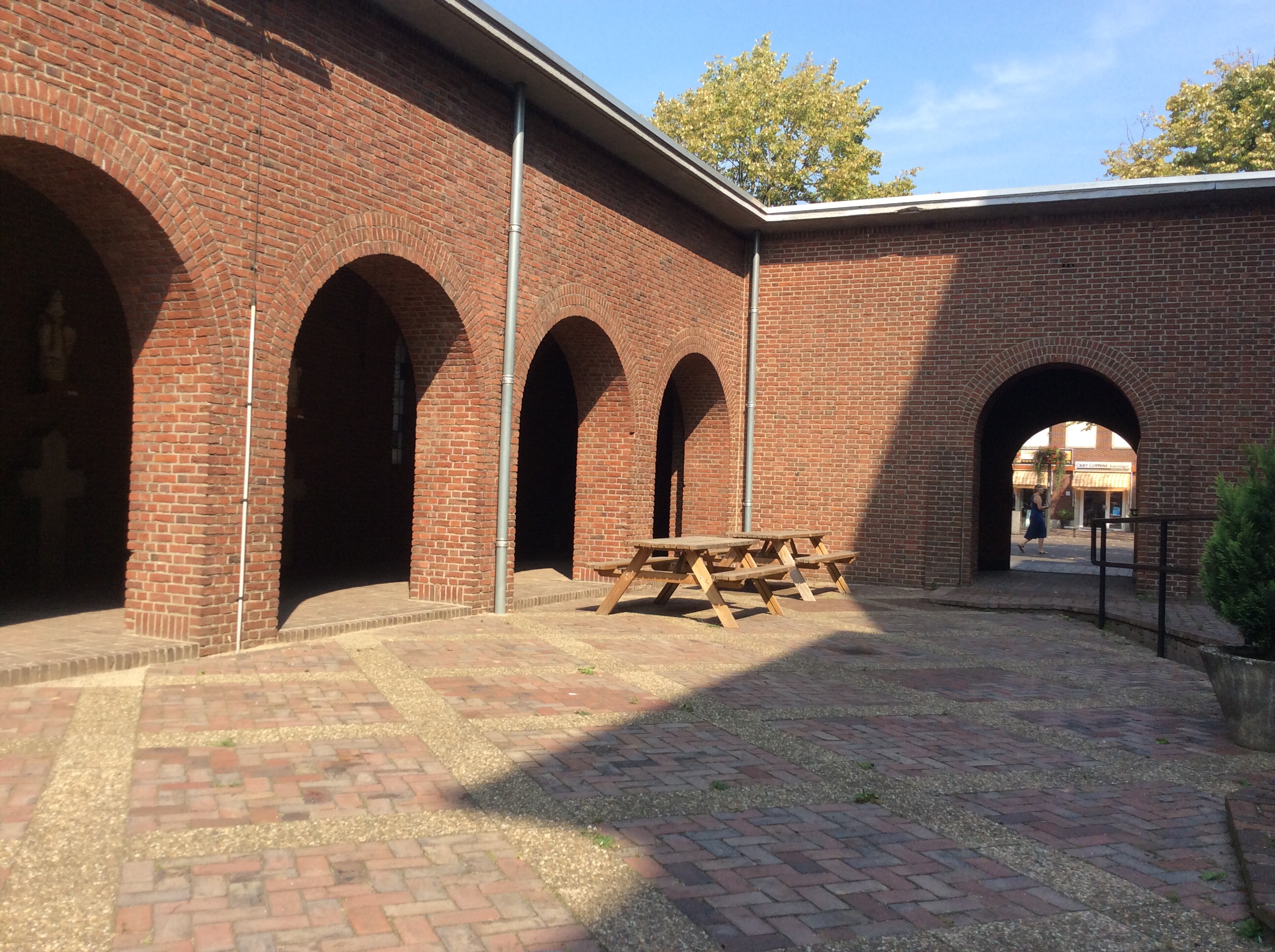 En misschien moet ik het hier ook wel bij laten. Met al dat geschuif zit ik nu vlakbij de hoofdingang van de kerk. De rust van het Atrium, midden in de drukte van het centrum van Horst, geeft een mooi contrast. Het carillon meldt me dat het twaalf uur is. De grote kerkklok bevestigt dat in een twaalfdelige monotonie. De zon draait sneller dan dat ik mijn verhaal kan afronden. Een foto ter bevestiging en dan is het zover. Mijn eerste bijdrage binnen de muren van de kerk. Ik trakteer mezelf zometeen nog even op de geur van wierook. Ik zit er tenslotte vlakbij.