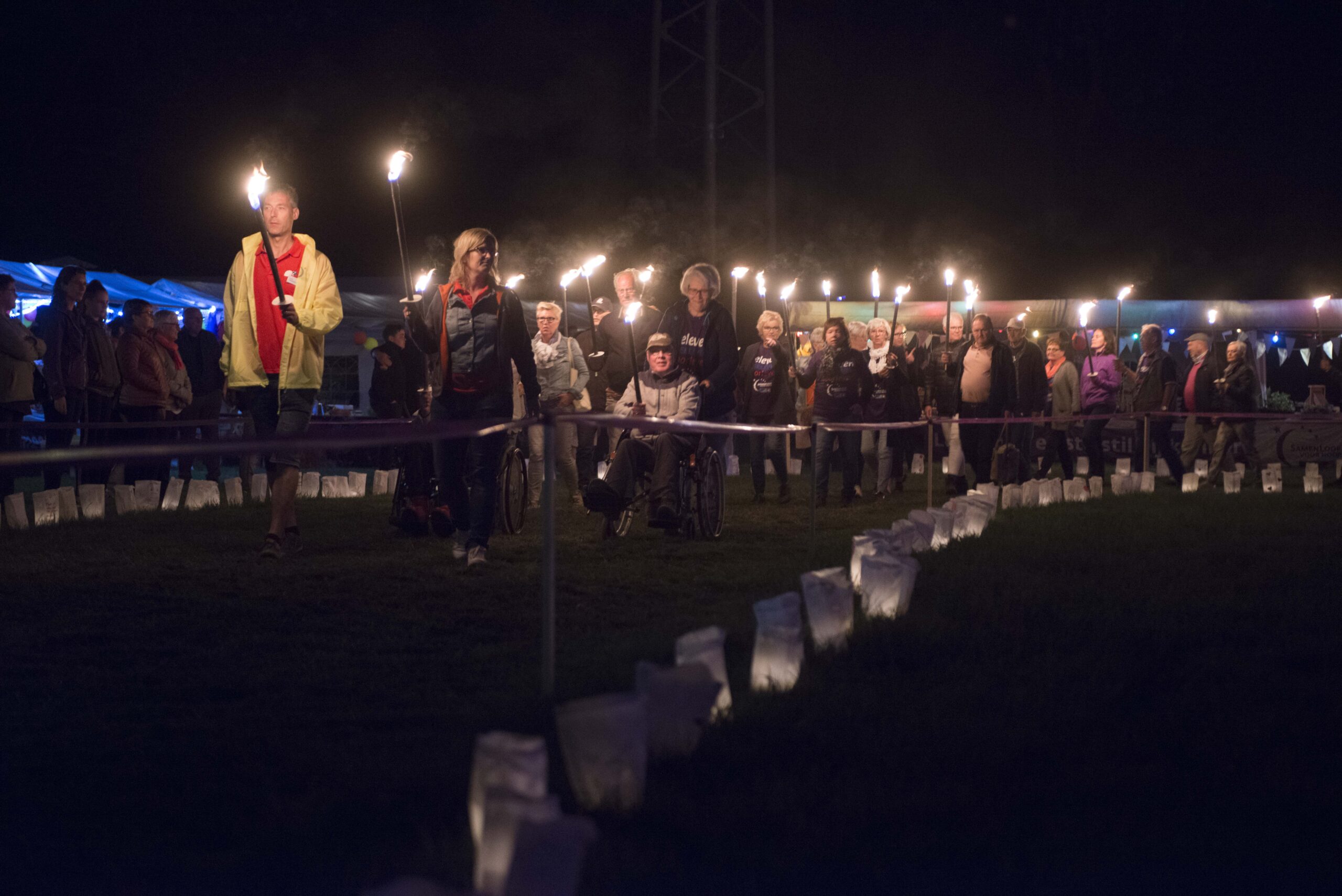 De toeschouwers voor het podium en de wandelaars op het veld hoorden de verhalen, genoten van de muziek en luisterden naar de gedichten. Onder de toeschouwers waren mensen die al gewandeld hadden of die nacht nog gingen wandelen. Tot zondagmiddag 14.00 uur, want dan zouden er 24 wandel-uren op zitten. En elke meter leverde geld op. Geld ten behoeve van onderzoek om kanker te bestrijden.