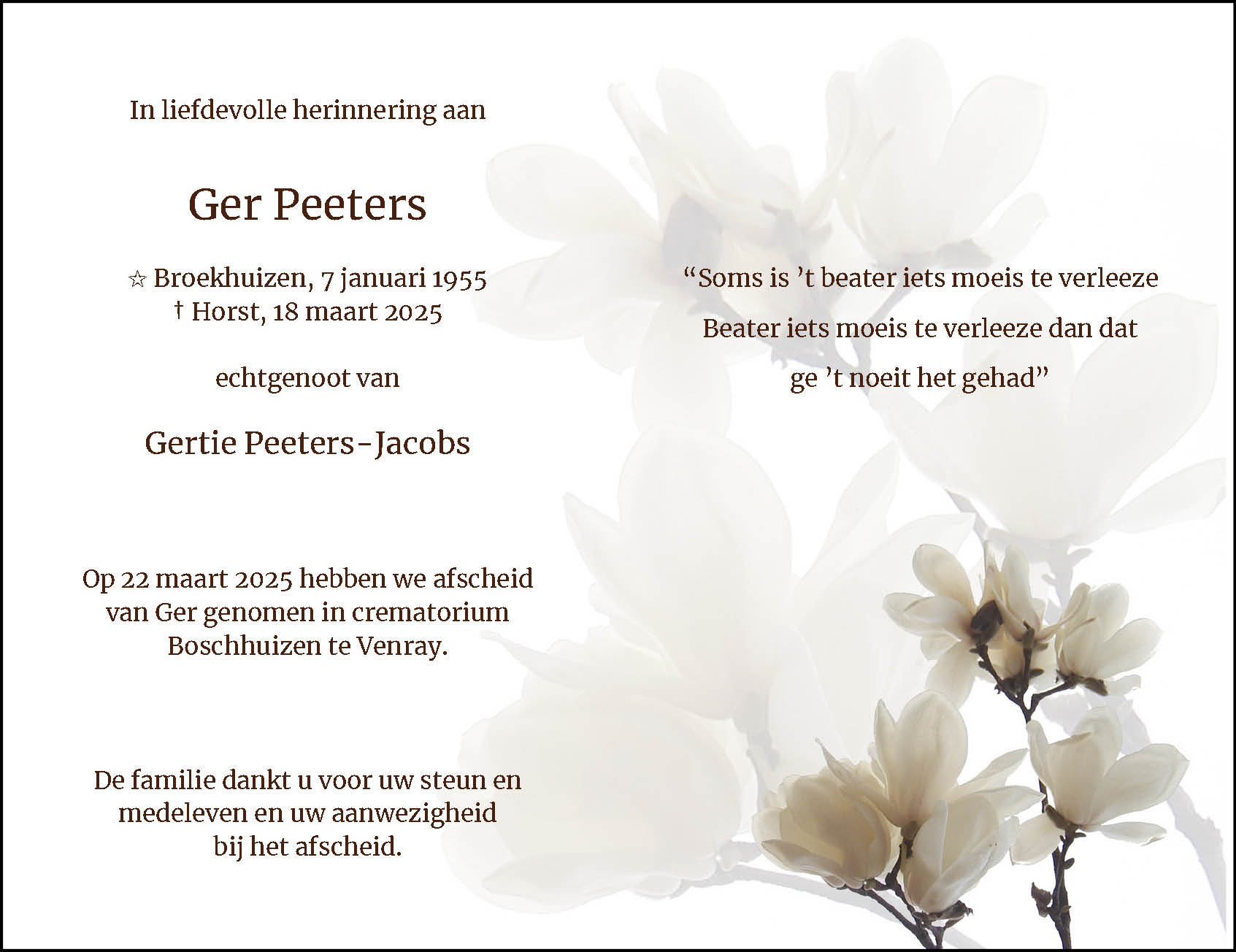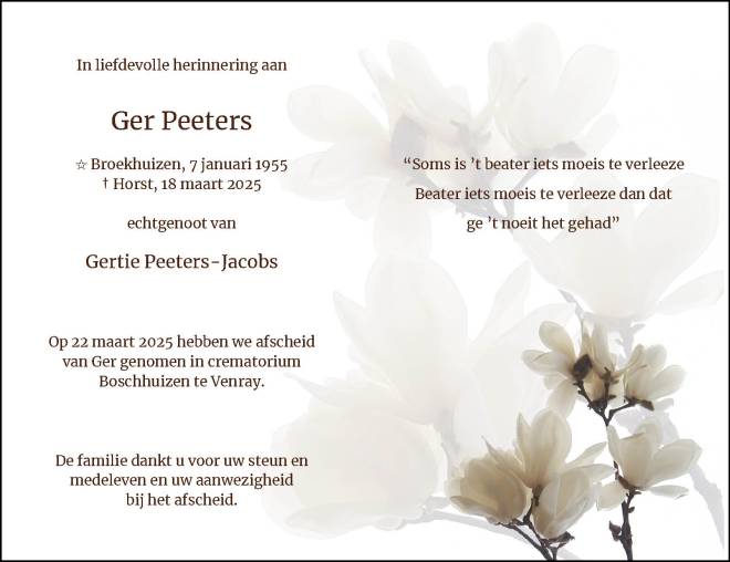 Dat, maar ook het aanwezig mogen zijn en getuige te zijn van wat er echt toe doet op zulke momenten, dat ervaar ik steeds als heel speciaal. Ik had in het eerste gesprek aangegeven dat ik een afscheidsbijeenkomst altijd probeerde af te sluiten met een zelfgemaakt gedicht, waarin ik het gevoel en de emoties van de ontmoetingen wilde vangen. Onder de indruk van de eerste kennismaking had ik thuis dat gedicht geschreven. Ik had Diny beloofd dat ik het nog aan haar zou laten horen. Bij de tweede ontmoeting heb ik het de familie voorgelezen. En juist bij die woorden brak Diny. Net als ik..