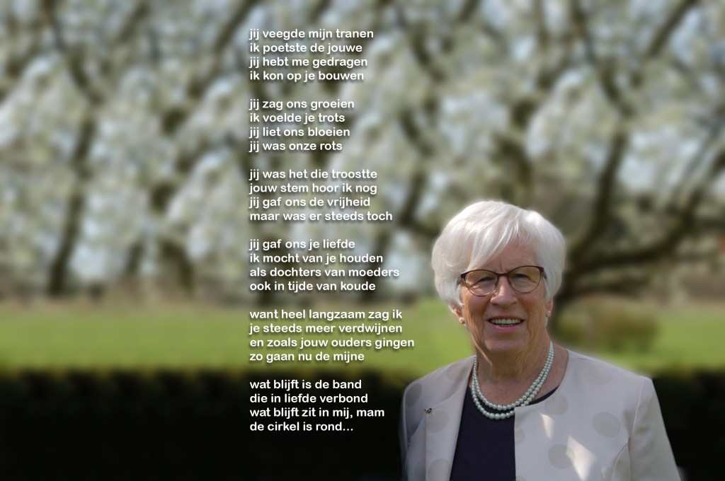 De dochters hebben me in de voorbespreking van de dienst geïnspireerd met de herinneringen aan hun moeder. Ik heb een aantal van die herinneringen in een lopende tekst mogen zetten en heb daar toen ook een gedicht bij gemaakt. Omdat afscheid van je moeder of vader een universeel thema is, heb ik die tekst en het gedicht hieronder gedeeld. Met toestemming van hun kinderen.