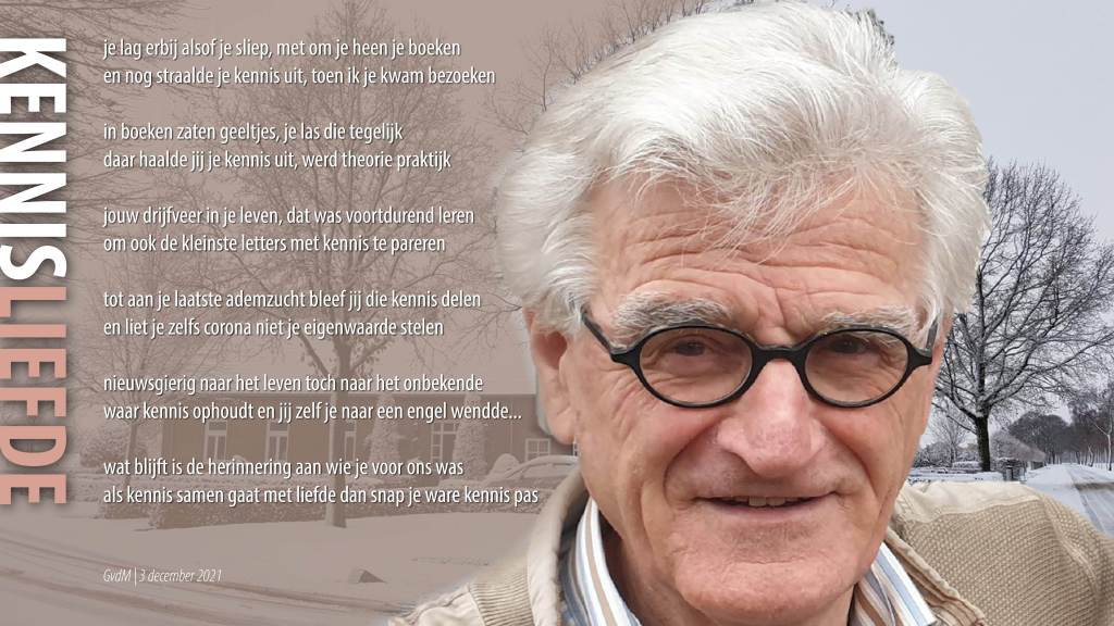 Het was een dienst die ik mocht begeleiden. Samen met Bea, Marwin en Eugènie had het levensverhaal gestalte gekregen, in de dagen voorafgaand aan de dienst. Mooie herinneringen aan Wim, bewaard in woorden, lieten een beeld zien van een man die in zijn leven op allerlei manieren veel had betekend voor zijn vrouw, zijn kinderen en kleinkinderen, maar ook voor zijn familie en voor de mensen waarmee hij een band had opgebouwd. De herinneringen inspireerden me om in een gedicht te proberen de essentie te vangen van wat met zoveel liefde verteld werd.