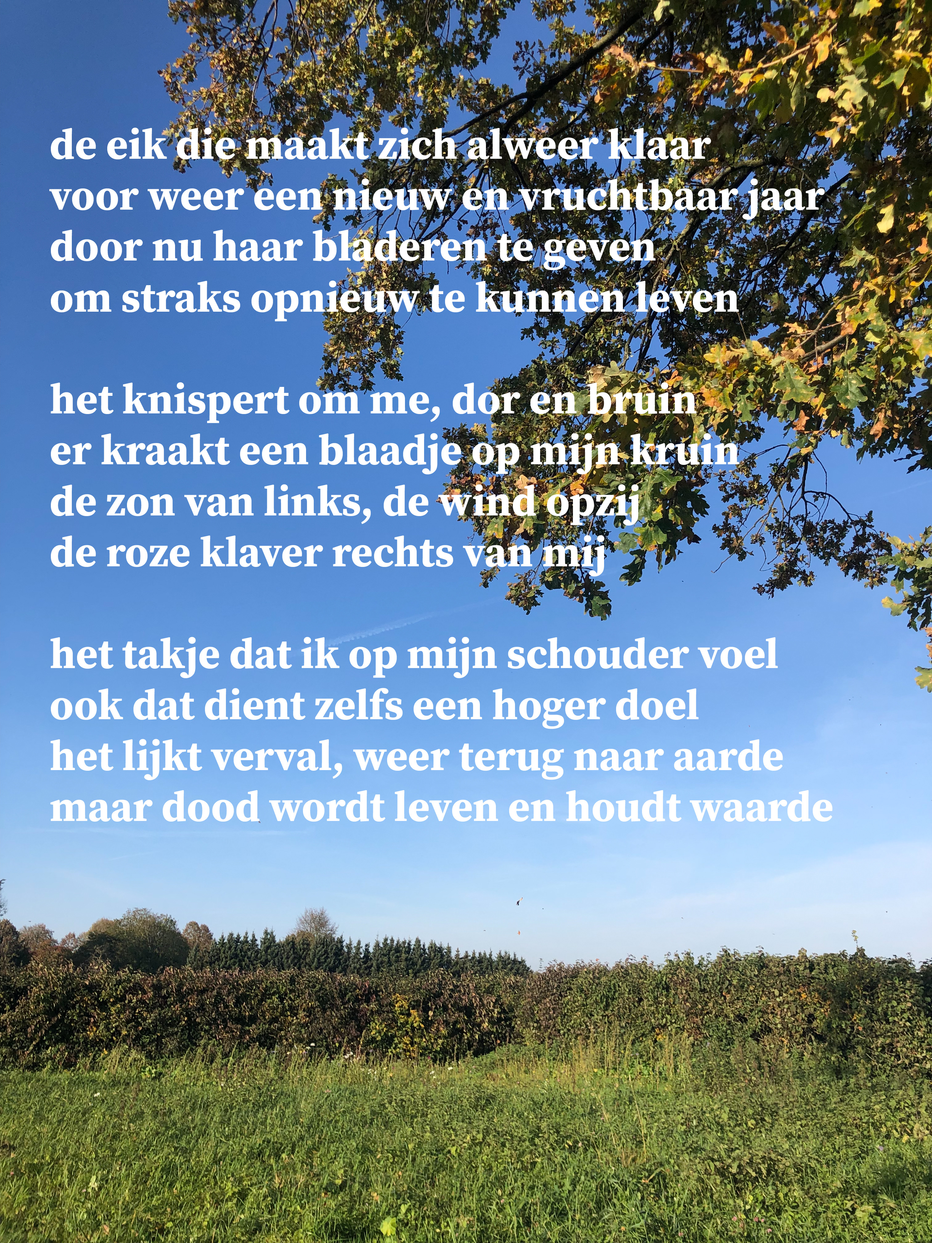 Ik kijk om me heen en laat de herfstwind mijn gedachten wat verwaaien. Er valt een blad uit de boom. Het landt op het water en drijft met de rimpelingen van de wind op het water mee. Ik zag het vallen, zonder geluid neerkomen en stilletjes wegdrijven. Verval in de herfst. Natuur die zich telkens weer vernieuwt. Die, zonder bijbedoeling, zinnige tegenstellingen creëert. Zomer, winter. Herfst en lente.