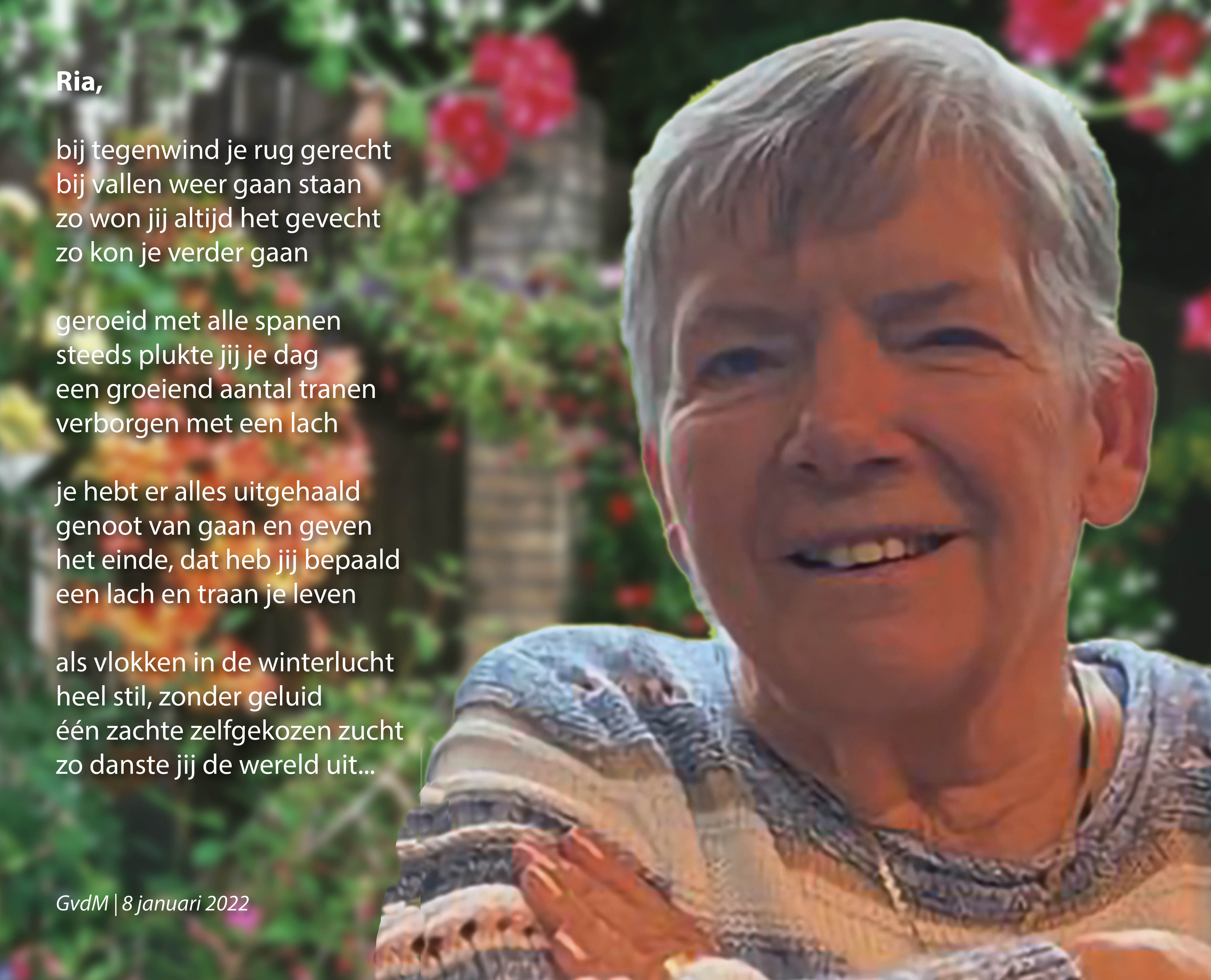Het was mooi hoe aan die tafel de kinderen hun verhaal over hun moeder vertelden. Er klonk liefde doorheen. Liefde waarvan de diepte soms ook zichtbaar werd wanneer een herinnering hen tot tranen toe roerde. Ze vertelden over hoe Lies tot het laatst nog zelf blaadjes en afgewaaide takjes van het gazon plukte en naar de tuinkorf bracht. Over de toerritjes die ze met Lies maakten omdat ze daar zo van genoot, telkens weer. Vertrekkend vanaf de oprit liet ze al overduidelijk blijken hoe fijn ze het vond. ‘Ik geniet nou al’, zei ze dan.