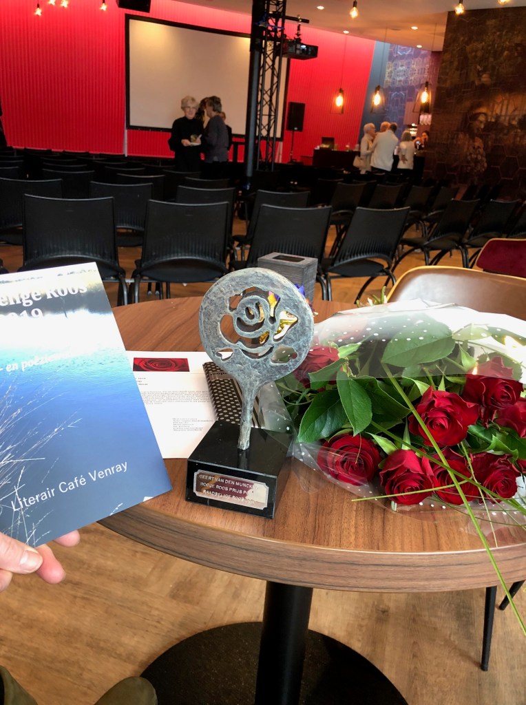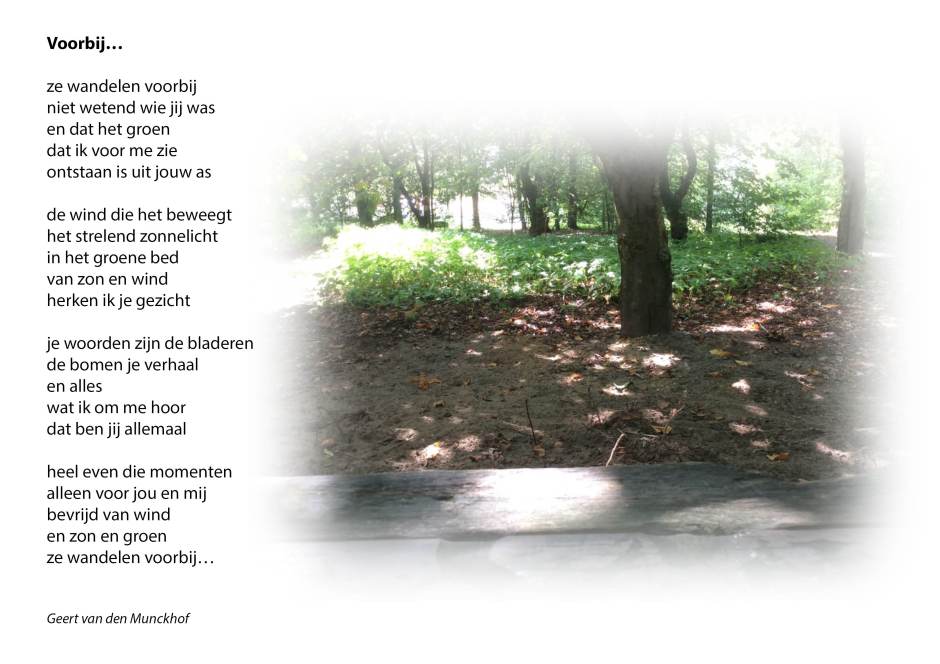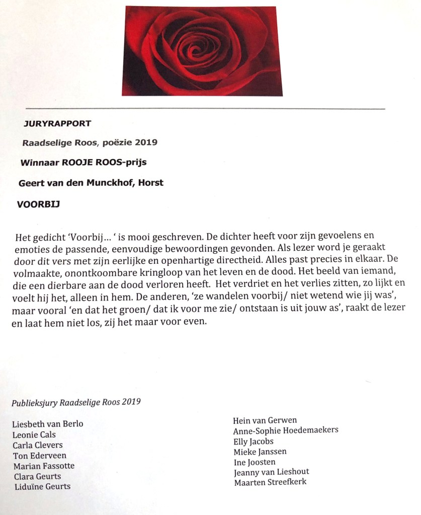 Een roos viel bijna geruisloos van haar kist, toen die door het gangpad van de stille kerk naar buiten werd begeleid. Haar zoon raapte de rode bloem stilzwijgend op, om die terug te steken tussen de groene bladeren van het bloemwerk. Maar hij bedacht zich. Buiten, in alle vrijheid, rook hij aan de roos. De zoete geur deed hem -vreemd genoeg en tot zijn eigen verbazing- denken aan de geur van geplette druiven. ‘Mijn moeder’, dacht hij en keek omhoog. ‘Ze heeft me gezien’.