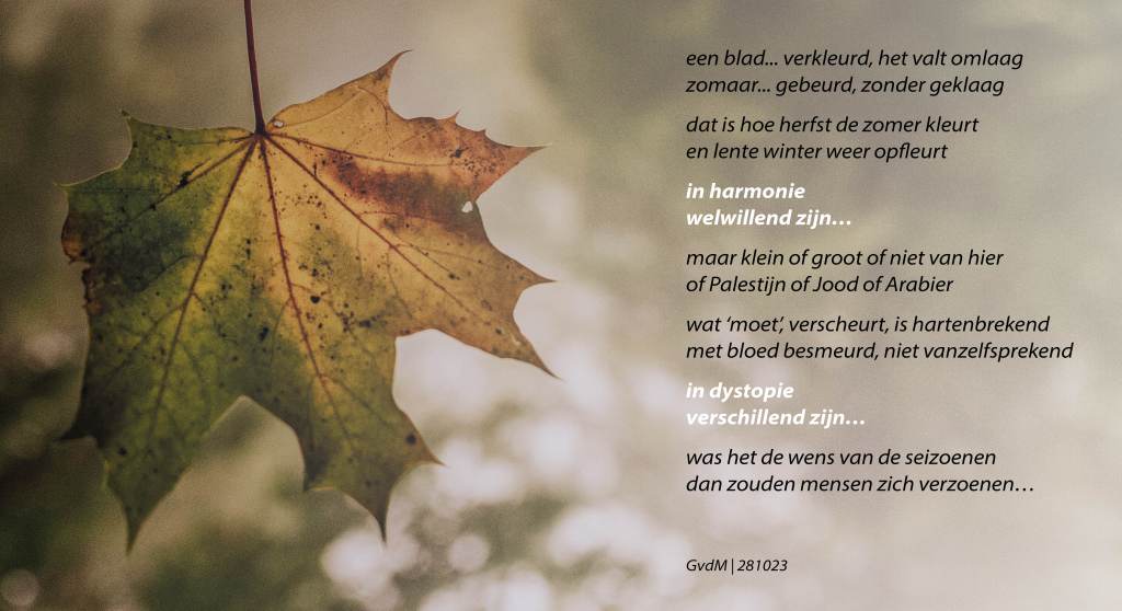 Zingeving. In de krant van vanochtend zou ik er naar hebben moeten zoeken, als ik me daar op dat moment bewust van was geweest. Als ik er, hier op het bankje, aan terugdenk, dan weet ik nog dat me bij een aantal artikelen een gevoel van zinloosheid bekroop. Zinloosheid en machteloosheid. Wat is de zin van de strijd tussen Israël en Hamas? Tussen Oekraïne en Rusland? Hoe zinloos is het wederzijds moorden en martelen? En hoe machteloos kijk ik er naar en lees ik er over. Mensen doen het elkaar aan. Zien zij er de zin van in?
