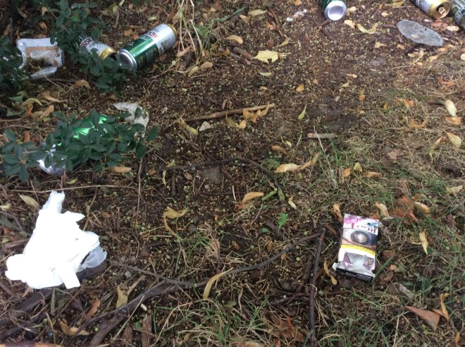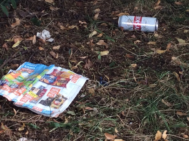 Afijn. Op een zondagmiddag heb ik weleens vaker van die confronterende, moedeloos makende wereldverbeterende gedachten. Het is het eerste dat bij me opkomt, terwijl ik ga zitten en om me heen kijk. Achter een boom ligt de meeste troep. Gebruikte servetten. Snoeppapiertjes en lege aluminium bakjes. Veel lege blikken en hier en daar een leeg pakje sigaretten. Als ik het van dichterbij bekijk, dan zie ik binnen- en buitenlandse merken, zowel op de blikken als op de sigarettenpakjes.