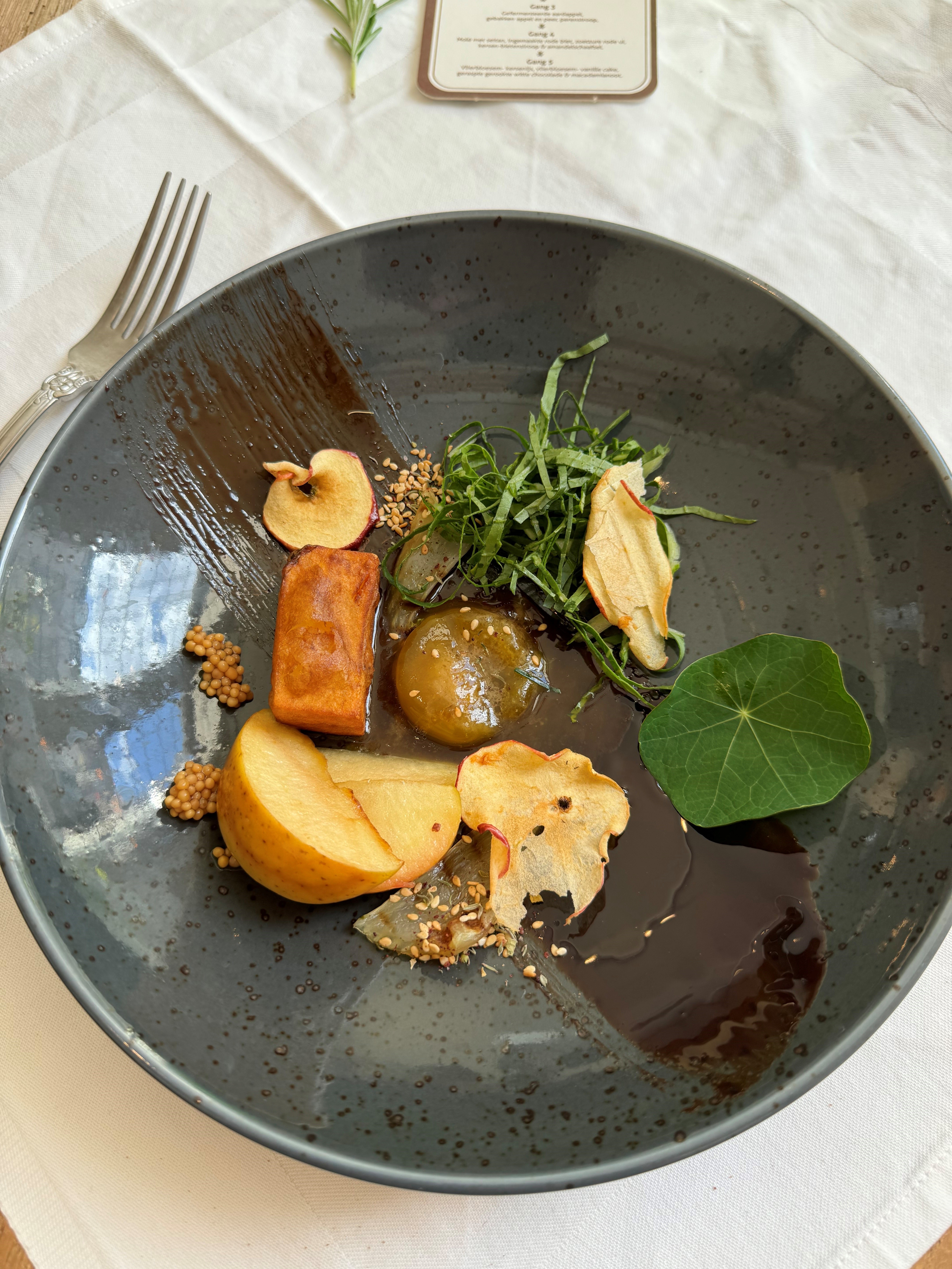 Ondertussen is het derde biertje geserveerd. Een ‘sour’ bier, dat ontstaan is door er in het brouwproces gerookte pruimen bij te gebruiken. Pruimen uit eigen tuin, vertelt Kitty. Het menu op het bierviltje vertelt dat we er zometeen gefermenteerde aardappel bij krijgen met gebakken appel en peer en perenstroop. Benieuwd hoe al dat fruit matched met de pruimen..