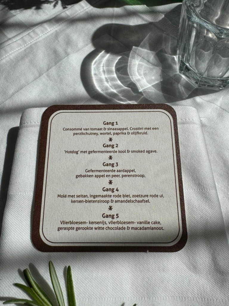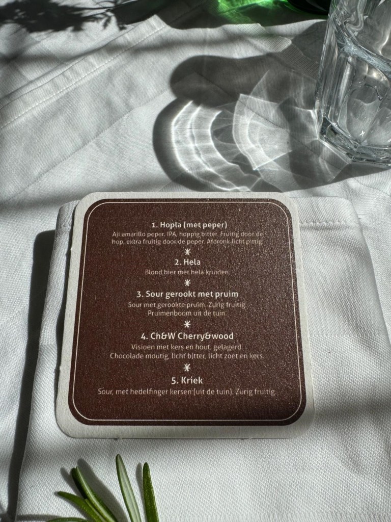 Dus hier zit ik nu aan een spontaan voor mij gedekte tafel. Aan een viertal andere tafels zitten mensen die waarschijnlijk wel van te voren gereserveerd hebben. Allemaal benieuwd naar wat er gaat komen en die nieuwsgierigheid vertaalt zich in gezellig gekeuvel. Maar omdat er weinig te communiceren is in je eentje (soms is dat best lekker 😋), besluit ik om gedurende het hele bierdiner mijn indrukken aan het (digitale) papier toe te vertrouwen. Daar gaan we!